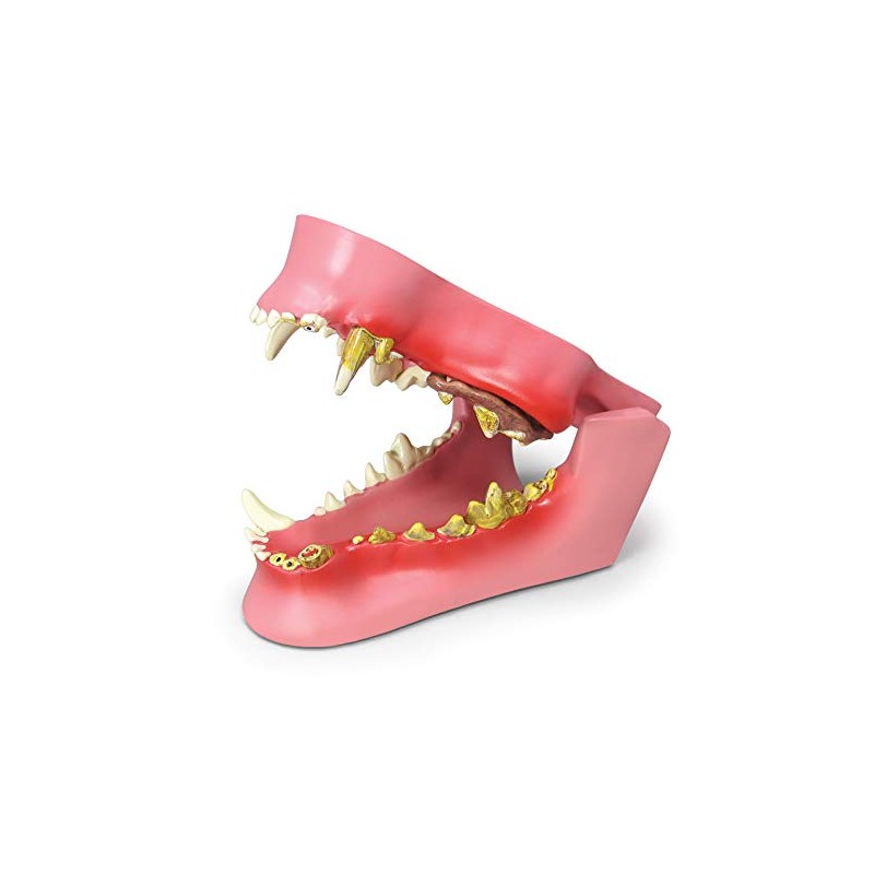 - FULL SIZE JAW - Model is an average size canine jaw showing healthy teeth on right side with diseased & damaged teeth on left side. Featured pathologies include fractured canine, periodontal disease, tartar accumulation, plaque, gingivitis, & more.