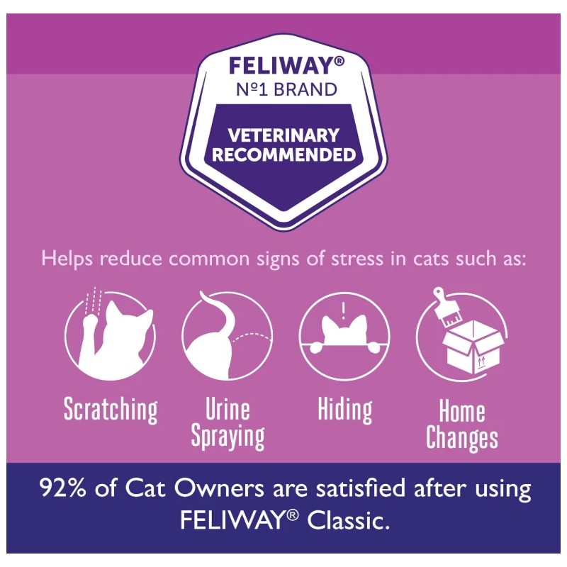 - FELIWAY Classic, developed by the #1 vet recommended brand, mimics natural feline facial pheromones to help reduce common signs of stress in cats.