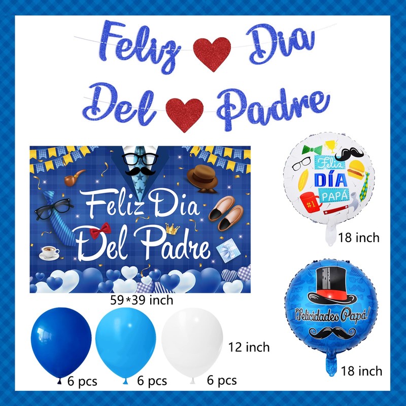 - Package includes: 1pc Feliz Día Del Padre Banner,1pc feliz dia del padre backdrop banner,2pcs foil balloons,18pcs Latex Balloons.
