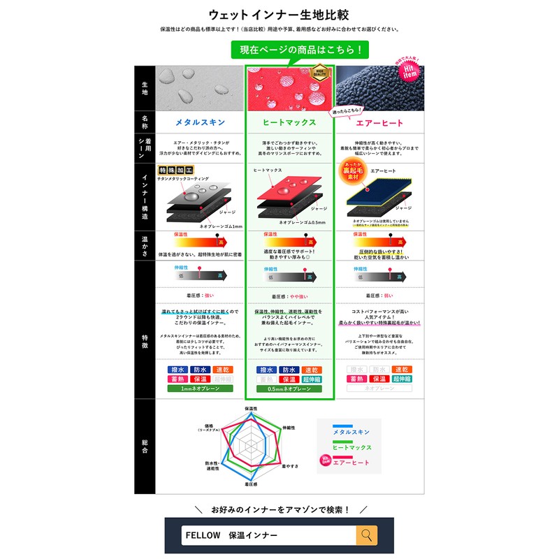 FELLOW Heat Max Thermal Inner, 0.02 inch (0.5 mm), Short John, Men's Surfing, Brushed Lining, Wetsuit, Semi-Dry Suit, Inner Sup, Japanese Standard, ML Size