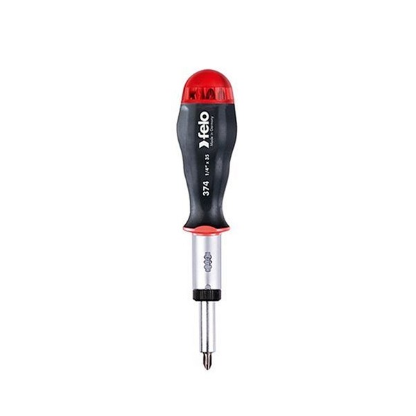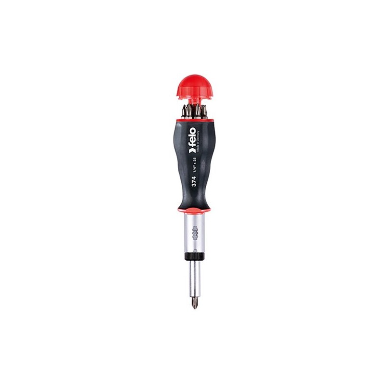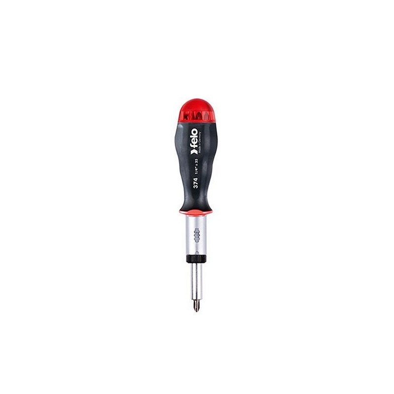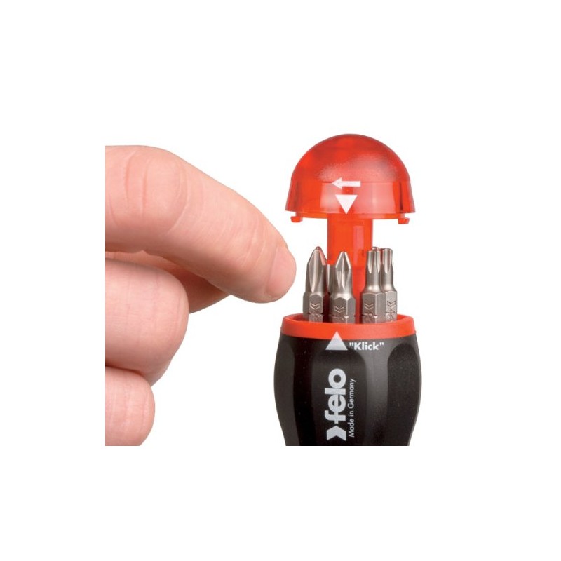 Felo Multi Bit Screwdriver with Reversible Ratchet and 8 bits, sizes 0.6 x 4.5 Slotted, 1.0 x 5.5 Slotted, 1.2 x 6.5 Slotted, Phillips #0, Phillips #1, Phillips #3, Pozidriv #1, and Pozidriv #2. Easy to reach bits, conveniently stored inside the handle.