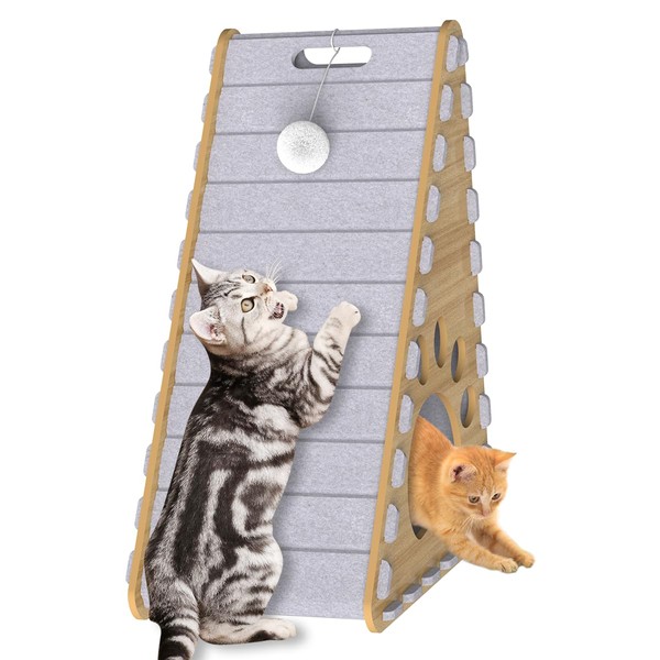 Felt Cat Scratchers for Indoor Cats, 27.5'' Triangular Vertical Cat Scratch Pad & Bed, Cat Scratching Pad with Fluffy Ball Hanging, Cat Scratch Ramp for Claw Health, Grey
