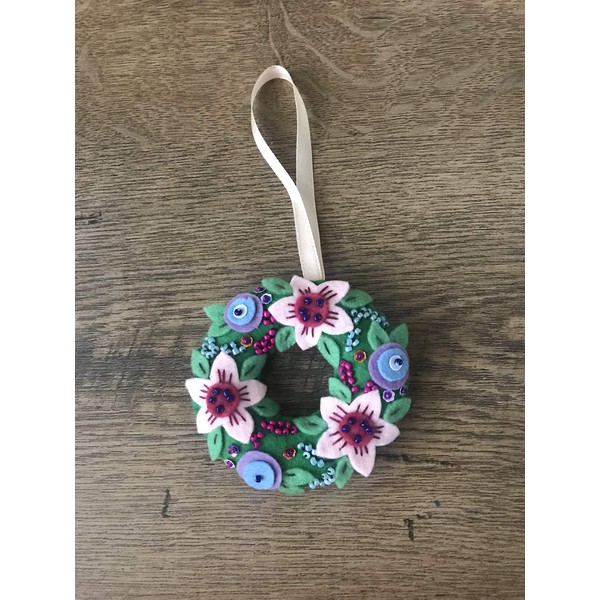 Handmade felt decoration - wreath with pink flowers. Made with quality felt, ribbon, threads and lightly stuffed. Hand sewn and no glue added. Made with love and best wishes. This is not a toy due to small details. Great as a home/Easter tree decoration or just a lovely gift. I am selling a lot of handmade decorations.