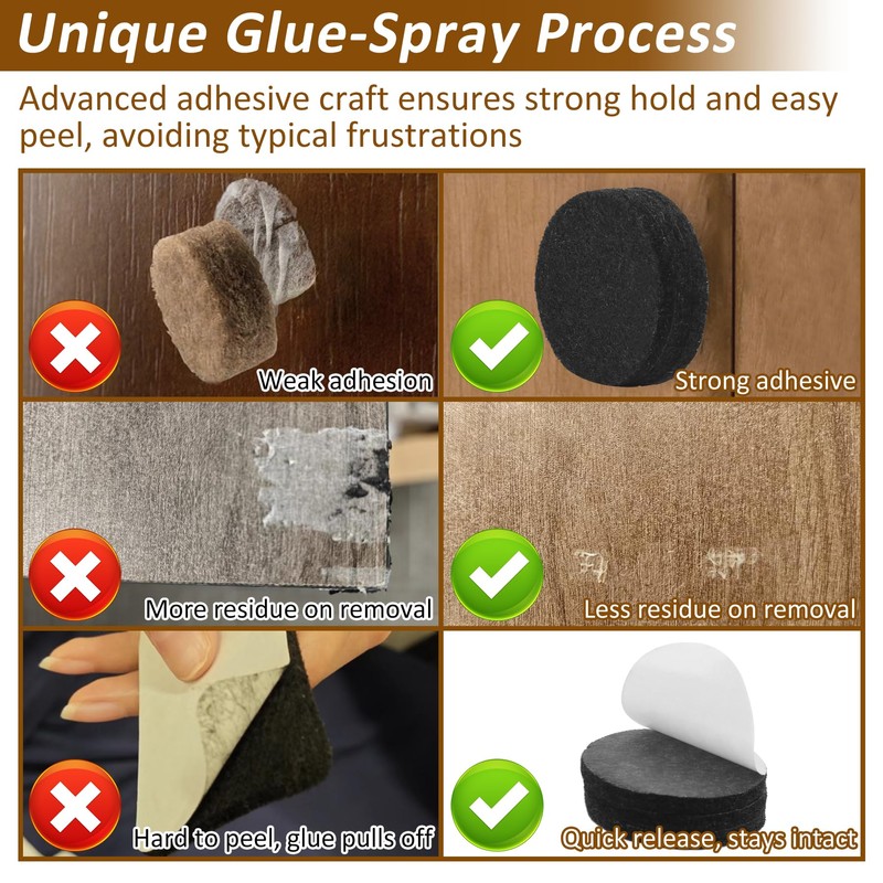 - Superior quality:Unlike most felt pads using standard adhesive, ours feature a unique glue-spray process for stronger adhesion, easier removal of the backing paper, and minimal residue when peeled off. We welcome you to compare with other leading brands you have used and see the difference for yourself