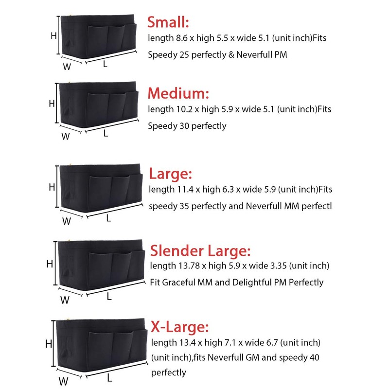 - Small:length 8.6 x high 5.5 x wide 5.1 (unit inch)Fits Speedy 25 perfectly & Neverfull PM; Medium:length 10.2 x high 5.9 x wide 5.1 (unit inch)Fits Speedy 30 perfectly;Large:length 11.4 x high 6.3 x wide 5.9 (unit inch)Fits speedy 35 perfectly and Neverfull MM perfectl; Slender Large:length 13.78 x high 5.9 x wide 3.35 (unit inch)Fit Graceful MM and Delightful PM Perfectly; X-Large:length 13.4 x high 7.1 x wide 6.7 (unit inch)(unit inch),fits Neverfull GM and speedy 40 perfectly