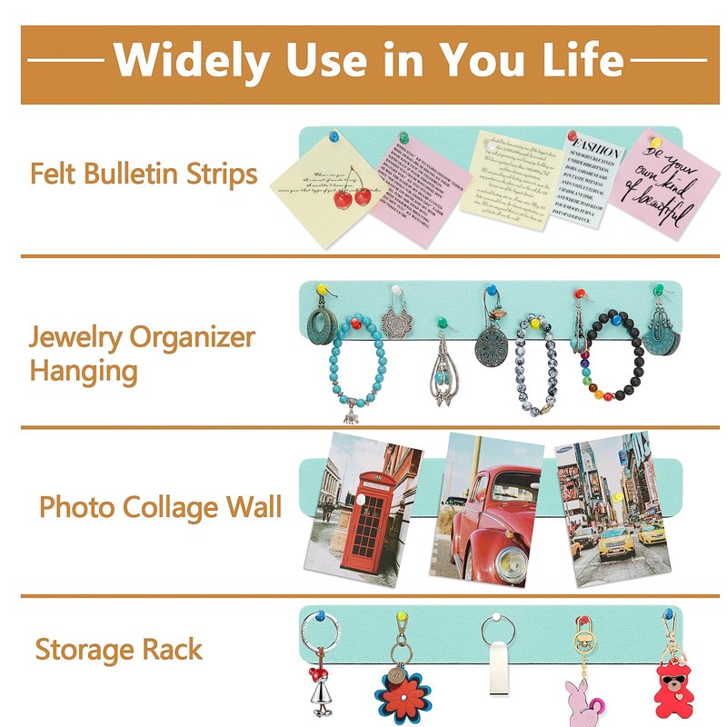 • 【Widely application】:Our 5 pack felt pin board bar strips can be used in different occasions to display pictures, notes, schedules, reminders ,what's more, you can also hang pendants like keys and necklaces.Feel free to use on the door, closet,refrigerator, bookcase, mirror, etc.