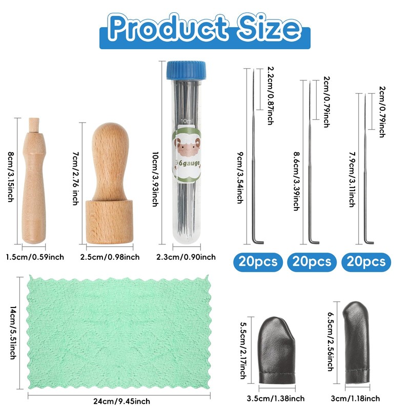 - Needle Felting Set: The felting needle set comes in a plastic box with 3 different sizes of felting needles, 20 pieces each, 2 pieces of wooden handles (1 needle and 8 needles), a pair of finger protectors, 1 piece of cloth.