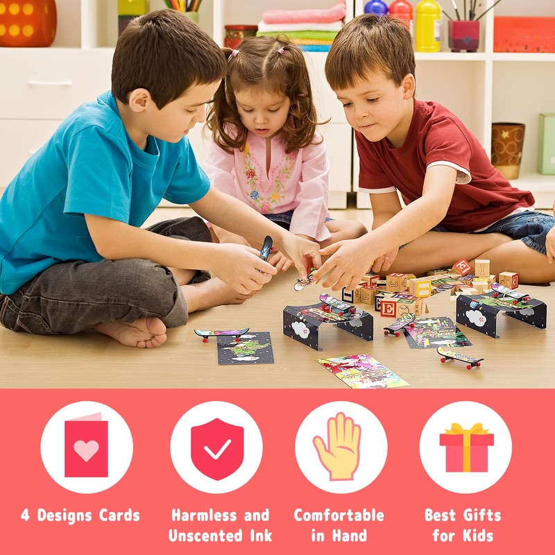 - Valentines Party Favors - Every Finger Skateboard comes with a greeting card. Attach one toy to each Valentines card. Mini skateboards provide hours of entertainment for kids alike.