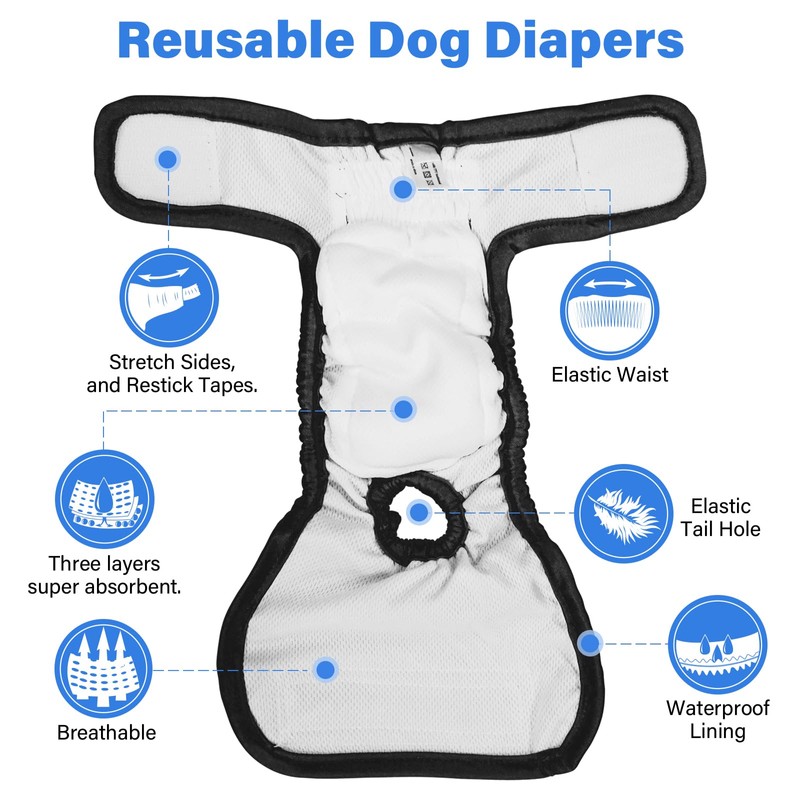 - Widely Used & Easy to clean:Hand or machine washable. Please fasten the hook and loop closure before washing to ensure long lasting and avoid sticking to other items, soft and comfortable dog diapers - To increase the comfort and acceptance of dogs, our diaper packaging has no "wrinkled" or uncomfortable texture, resulting in many dogs not liking regular disposable diapers. The hook-and-loop closure allows for quick and easy donning and doesn't stick to your pet's fur.