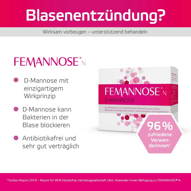 - Accompanying use for antibiotic therapy: Femannose N can also be used in the case of antibiotic therapy in acute bladder inflammation (cystitis). It synergistically supports the effect of antibiotics.