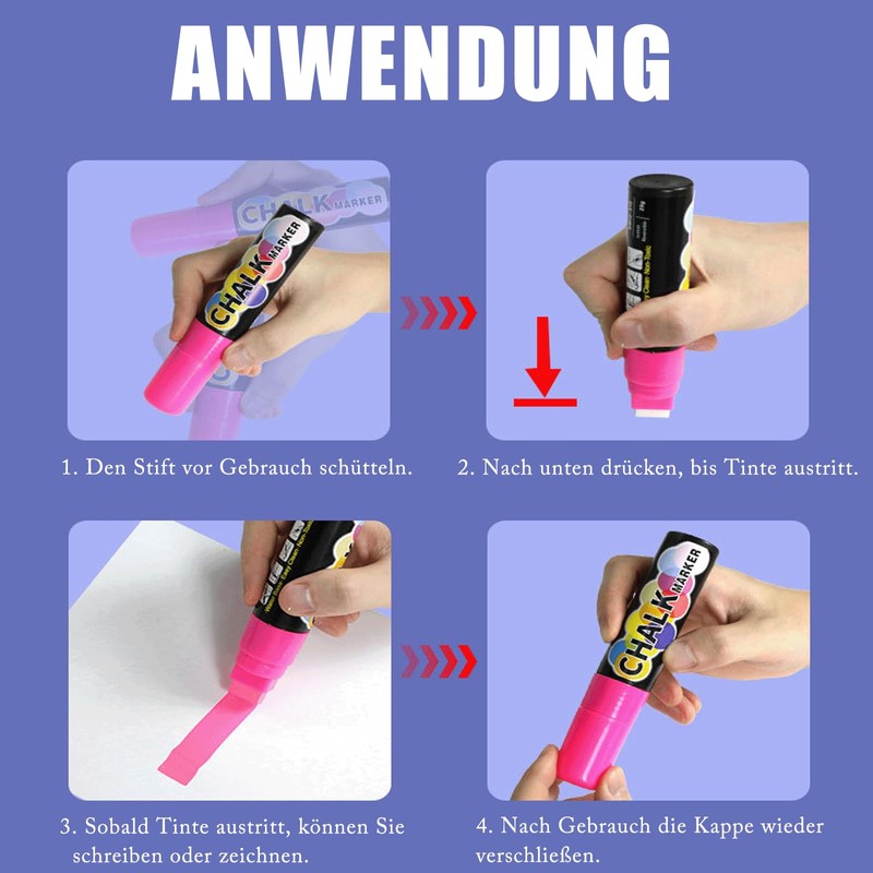 - Features: This chalk pen washable made of high-quality materials offers a large capacity, is easy to erase (it dries completely after 72 hours), writes evenly and provides excellent colour coverage. The three-dimensional pen tip allows different line widths at different writing angles.