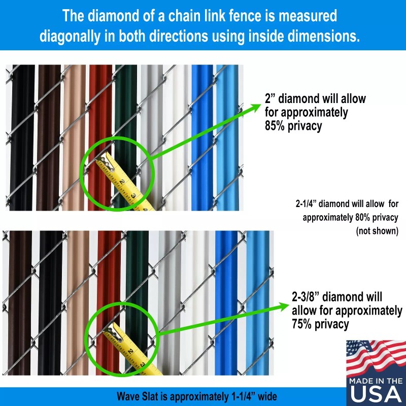 Colors Available: Beige, Black, Brown, Green, White, Redwood, Sky Blue, Royal Blue and Gray Installation: Insert the locking channel by sliding it through the bottom of the chain link fence (see picture). Insert the privacy slat from the top of the chain link down towards the locking device at the bottom of the fence until it clicks into place (see picture). The slat is not woven in and out of the diamonds - the slat should simply slide down through each diamond of the chain link. Look from the top of the chain link fence and you should see where the slat is installed (see picture). The locking device will help secure the slat into place. How to Measure the Diamond Size of Chain Link Fence: The diamond of a chain link fence is measured diagonally in both directions using inside dimensions. You need to know the chain link fence diamond size before you can order fence slats. The picture shown with the Tape Measure, the chain link diamond size is approximately 2-1/8 inches. This slat will fit 2 thru 2-3/8 inch chain link diamond. The smaller the diamond the more privacy you will get. Returns: We accept returns of all unopened items within 30 days of delivery. |