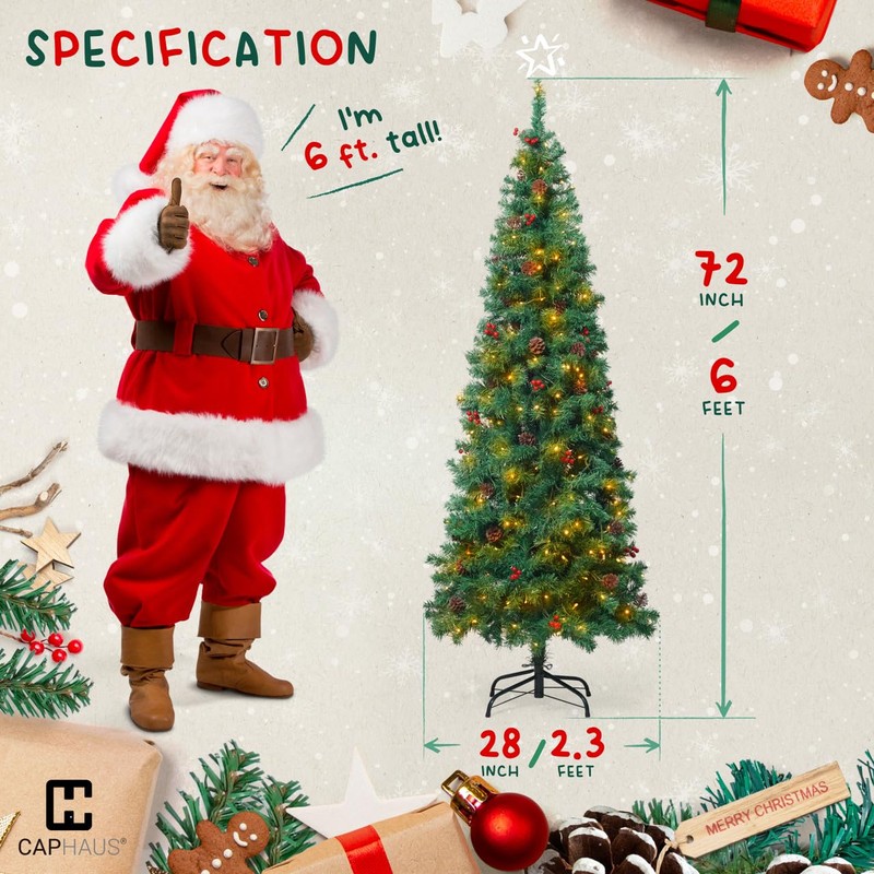 - 🎄250 LED Lights, Decorative Pinecones and Berries: Our 6 feet pre-lit pencil Christmas tree made with 250 LED lights that cast a warm glow. Adorned with pinecones and berries, this slim tree embodies the spirit of the season, creating a rustic and festive ambiance that captures the heart of the holidays. Please note that this is an electronic product, it's recommended to use indoors only.