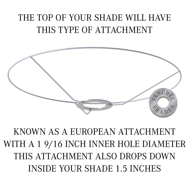 By request, you may specify changes to the dimensions, covering or the hardware color. (Extra charges may be necessary.) This shade is equipped with a European fitter. This is a special attachment type with a 1 9/16" center hole. The attachment is positioned 1.5" below the top of the lampshade. A screw-cap is removed, and the shade is positioned to rest on the flat part of the cap. Then, the cap is turned back on, holding the shade in place. Make sure of the 1 9/16" inner diameter measurement, as different measurements are possible for similar attachment types. The inside is a white styrene (white plastic). The top and bottom of this item is adorned with a 1/2" band of single fold lampshade trim. The trim is the same color as the covering.