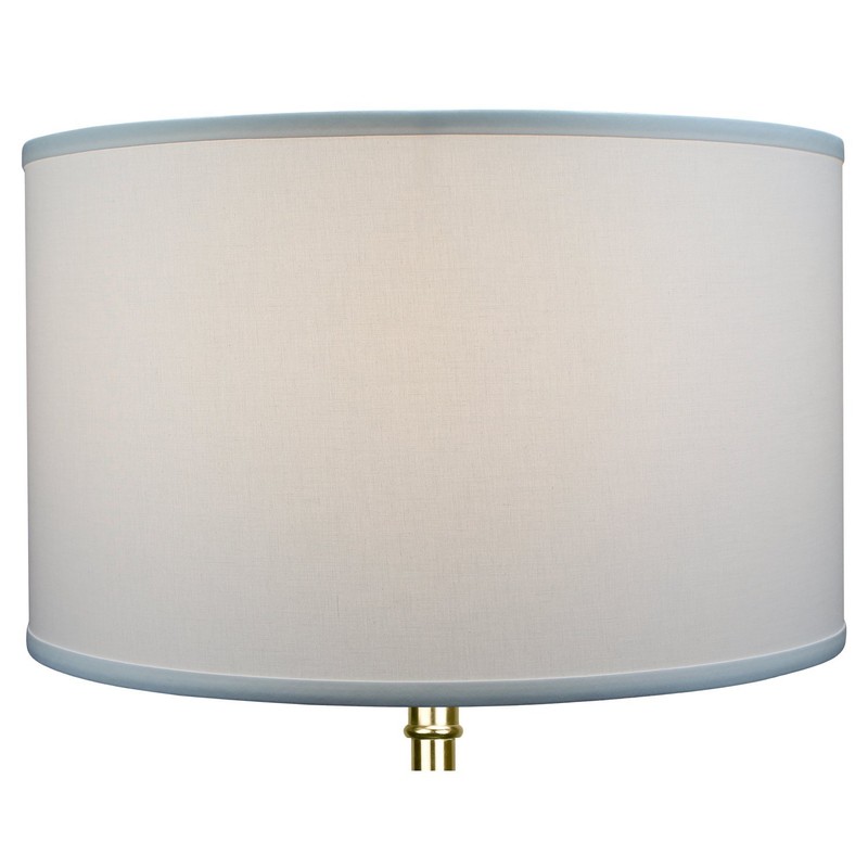 This lamp shade is not an imported product. It is made with pride in the USA, and construction does not begin until you place your order. By request, you may specify changes to the dimensions, covering or the hardware color. (Extra charges may be necessary.) This shade is equipped with a Washer fitter. This is the most common fitter type. It consists of a small washer with an inner diameter hole size of approximately 1/2". The washer generally rests on the top of a metal harp above the light bulb and is held in place by a screw-on finial.The outside of the lamp shade has a fabric covering. The inside is a white styrene (white plastic). The top and bottom of this item is adorned with a 1/2" band of single fold lampshade trim. The trim is the same color as the covering.