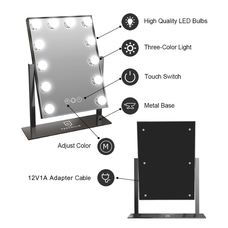 - This vanity mirror with lights has 12pcs non-replace LED bulbs providing a large and bright viewing,adjustable brightness and 3 lights colors (day light、cool white、warm yellow) helping you achieve a flawless professional makeup.