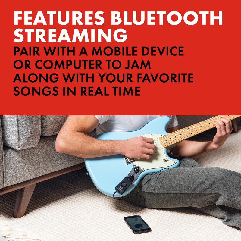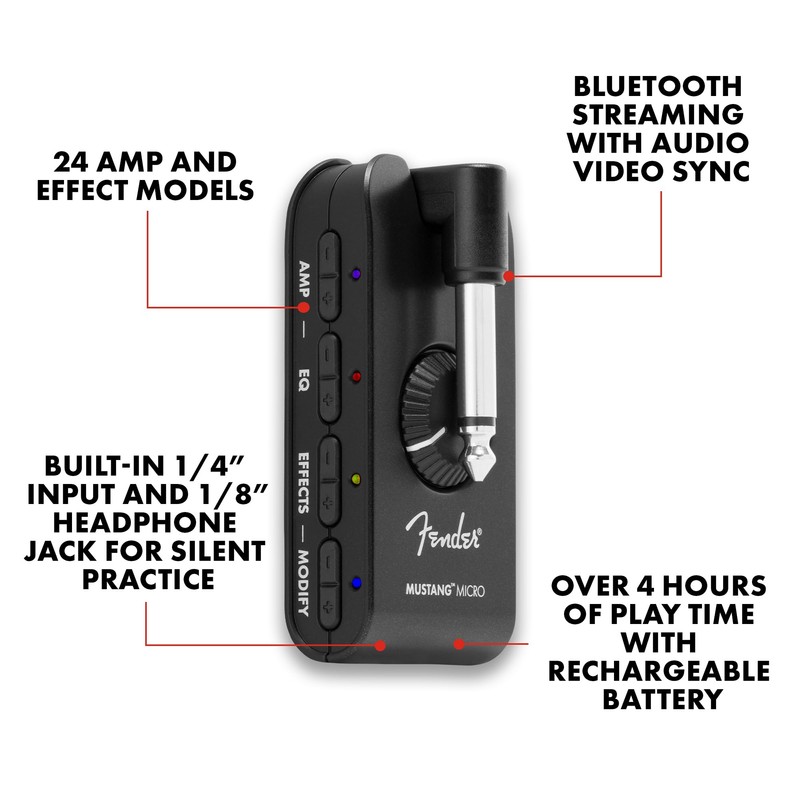 Mustang Micro is a complete personal guitar amplifier featuring a wide selection of tones from the wildly popular Mustang series amps. Plug Mustang Micro directly into your guitar, connect a pair of headphones, and choose your amp and effects. It’s ideal for any player from beginner to pro, making it quick and easy to get great tones when jamming silently at home or on the go. And you can play along to your favorite tracks or instructional videos using the built-in Bluetooth audio connection.