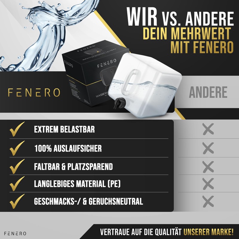 - A unique all-in-one set – Feneros' foldable water canister leaves nothing to be desired: in addition to our water container with tap, you will also receive a transport closure