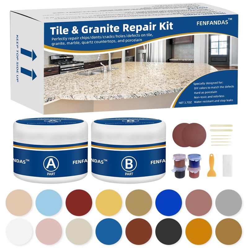 FENFANDAS Tile and Granite Repair Kit, Marble Porcelain Stone and Quartz Countertops Repair Kit for Chips Dents Cracks Holes Scratch, Fix Chipped Edges Corners, Reattaches Missing Pieces