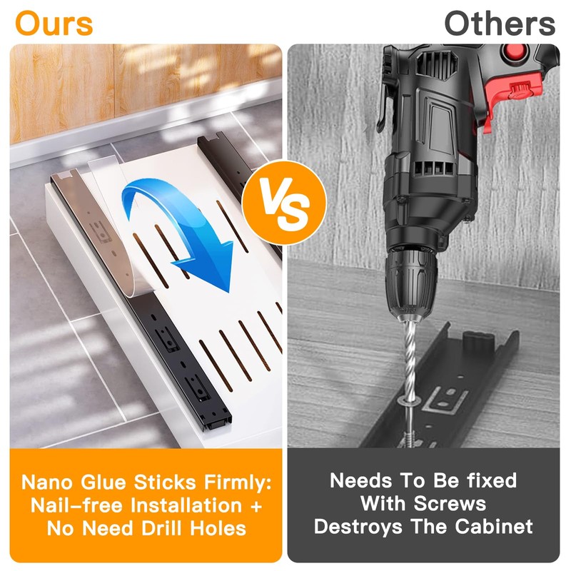 - 【Durable Material】The slide out cabinet organizer is made of thickened carbon steel with multi-layer protection. The cabinet slide out shelf is not easy to be damaged or paint off. Compared with the traditional drawer cabinet, it can better play the role of waterproof, rustproof and corrosion resistance.