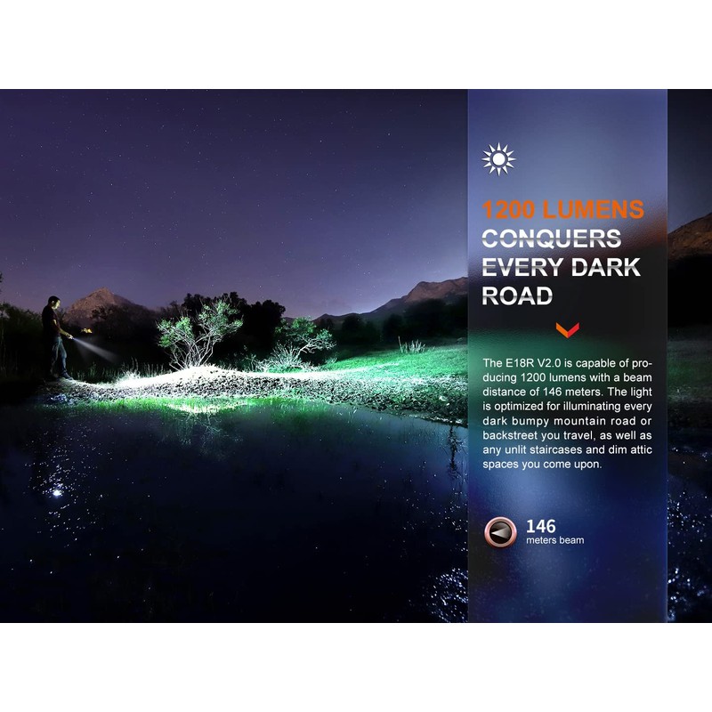 - BRIGHT EDC FLASHLIGHT - The Fenix E18R v2.0 rechargeable flashlight delivers a 1200 lumen beam with distances up to 159 yards.