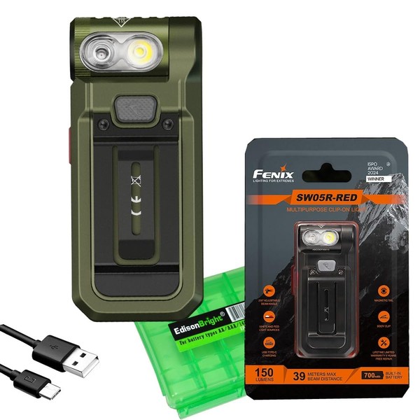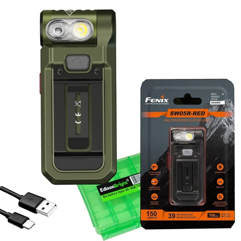 Fenix SW05R-RED Clip On Flat Body swival Flashlight with Red Light with EdisonBright Accessory case Bundle (Green)