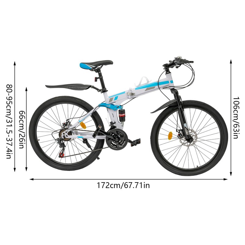 This mountain bike will be your ideal companion for both urban exploration and outdoor adventures. Its lightweight and tough frame with smooth-shifting 21-speed gear system and seven-piece alignment wheels make it easy to ride on both steep and flat roads. The unique folding design makes storage and carrying easy and convenient. The front and rear dual shock absorbers, and double disc brakes allow you to ride smoothly and safely even on the rough mountain roads, allowing you to fully enjoy the joy of outdoor cycling.