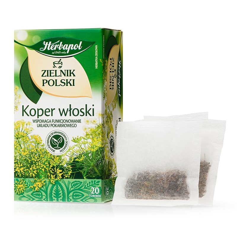 Fennel Herbal tea 100% fennel fruit. Fennel helps to eliminate the feeling of bloating and flatulence, and has a positive effect on digestive processes, supporting the correct functioning of the digestive system. The claimed beneficial effects may be observed when infusions from 2 tea bags are consumed daily. The product is recommended to be consumed in 2-week cycles with intervals between. Do not use if hypersensitive to fennel. A balanced and varied diet, as well as a healthy lifestyle, are essential to ensure the proper functioning of the body. Store in a dry place. Protect from light. Package contents: 36 g (20 bags x 1,8 g)