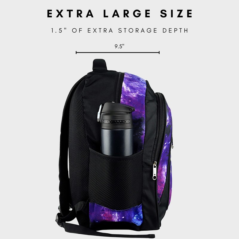 - EXTRA SPACIOUS: 10 Compartments, 18"H X 13"W x 9"D - Holds large 3 ring binders, books, laptop, lunch box, and much more for busy students.: Each of this Galaxy style backpack contains 3 large compartments with multiple interior pockets and a laptop sleeve to hold books, tablets, binders, and everything else a child needs to excel at school.