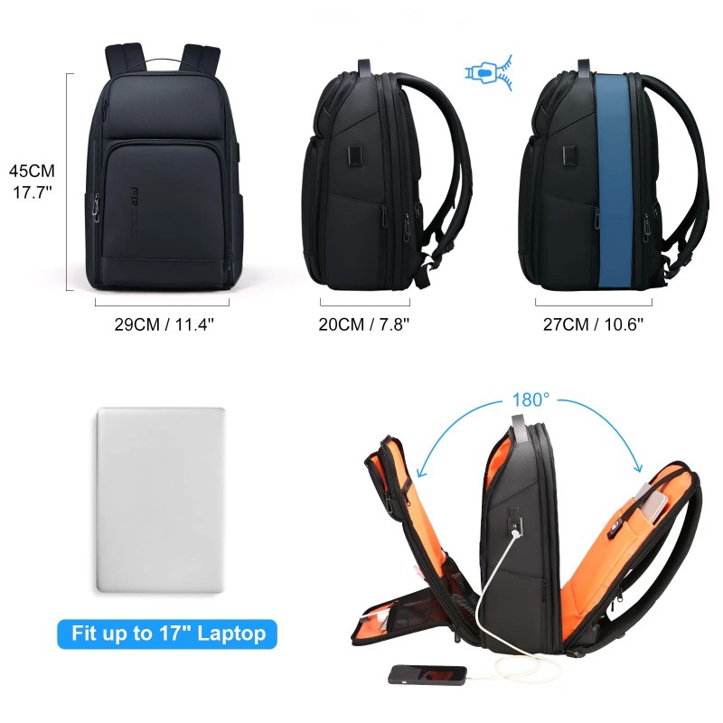 [ MULTI-COMPARTMENT ] Dimensions: 17.7 x 11.4 x 7.8 - 10.6 inches. It has plenty of room & pockets for anything you need to carry. You can put your power bank, USB cables in different layers. The padded computer compartment fits laptops up to 17"