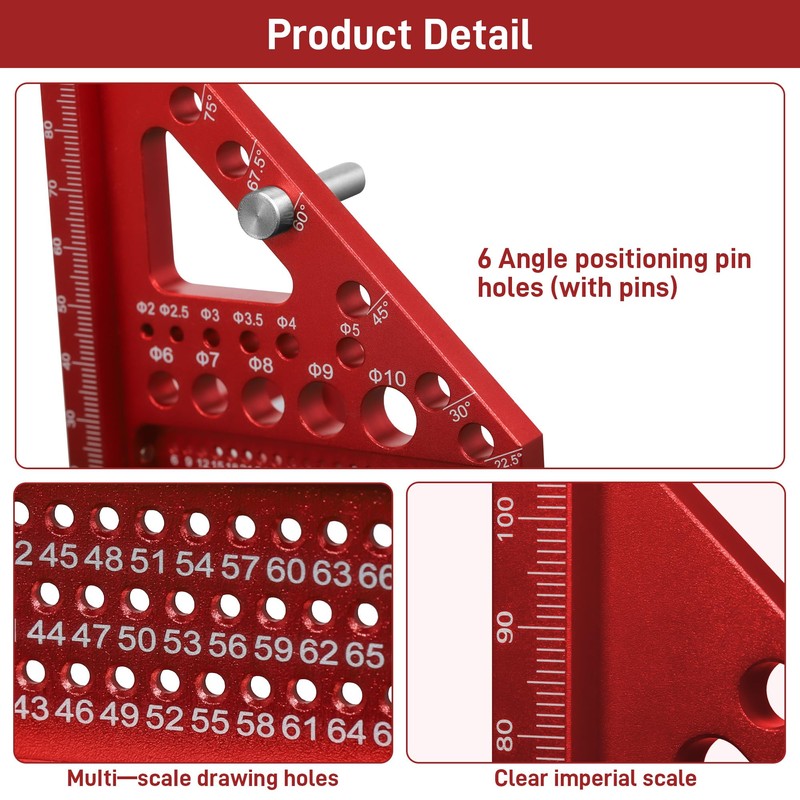 - 【Multi-Angle Design】Our compact speed square is designed with 6 marking hole with 1/16 inch diameter for drawing angles from 22.5 to 90 degrees. It also includes preset angles of 22.5°, 30°, 45°, 60°, and 67.5° with corresponding Φ1/4 angle pins, enabling easy and accurate angle drawing. Not only ideal for woodworking and construction, but also perfect for DIY enthusiasts, decorators, and engineers.