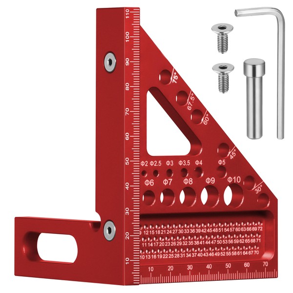 Fentar 3-D Speed Square, 22.5-90° Aluminum Alloy Combination Square, Accurate Carpenters Square with 11 Different Drill Holes and Positioning Aid, Multifunctional Woodworking Tools Set Square, Red