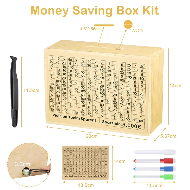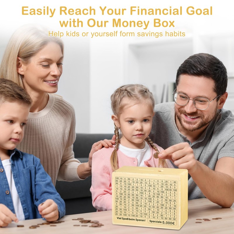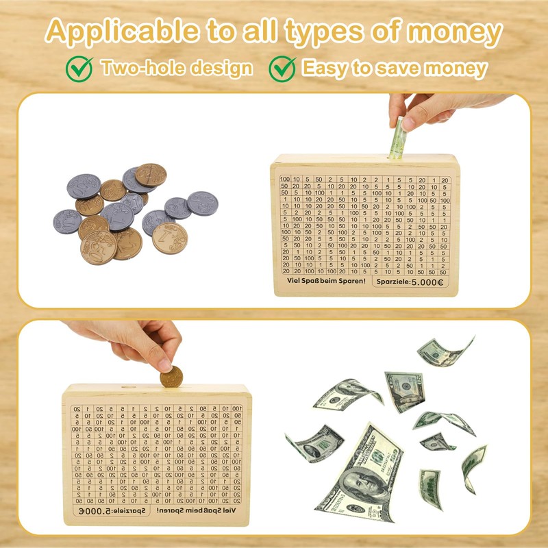 - 【Premium Material & Classic Design】The saving challenge box is made from high quality natural wood with polish finished, which makes it durable, shatterproof, smooth without burrs, ensuring long-term use. The money saving box's delightful design makes it a wonderful addition to any room - be it a nursery, child's bedroom, or a stylish office.