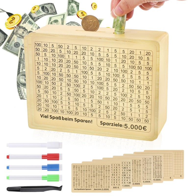 Fentar Wooden Money Box, Money Saving Box with 4 Marker & Eraser, 10000 Saving Challenge Box with ϵ 500- ϵ 10000 Target, Value Vault Money Box for Kids Adults, Reusablemoney Box, Piggy Bank for Gift