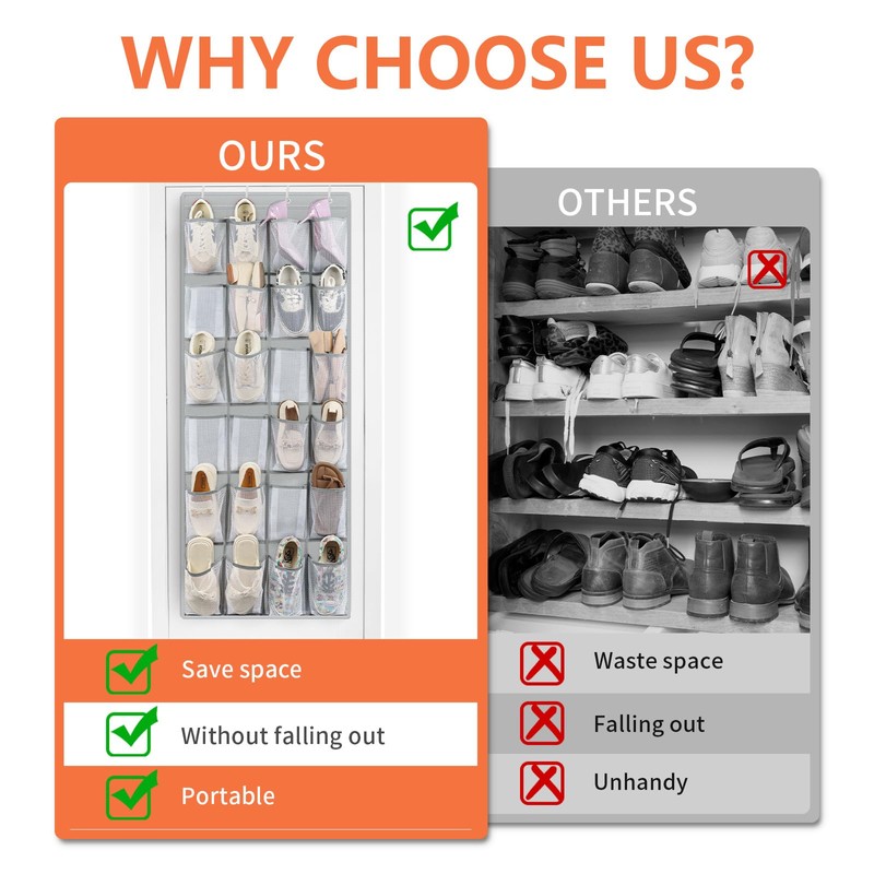 - Save Space & Maximize Storage: Our door shoe organizer takes advantage of unused vertical space, freeing up floors and walls—ideal for entryways, closets, bedrooms, apartments, or dorms. Hanging shoe organizer maximizes storage capacity, allowing you to store more shoes in tight spaces while keeping your home neat and clutter-free!