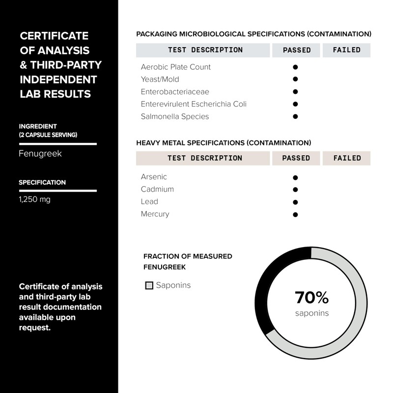 - Ultra High Strength Extract: Each serving delivers a concentrated dose of 1,250mg fenugreek extract, equivalent to 25,000mg of raw fenugreek powder, standardized to 70% saponins.
