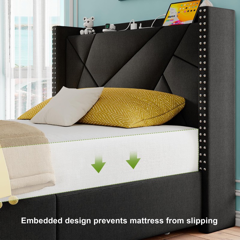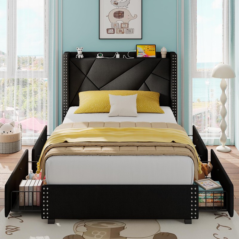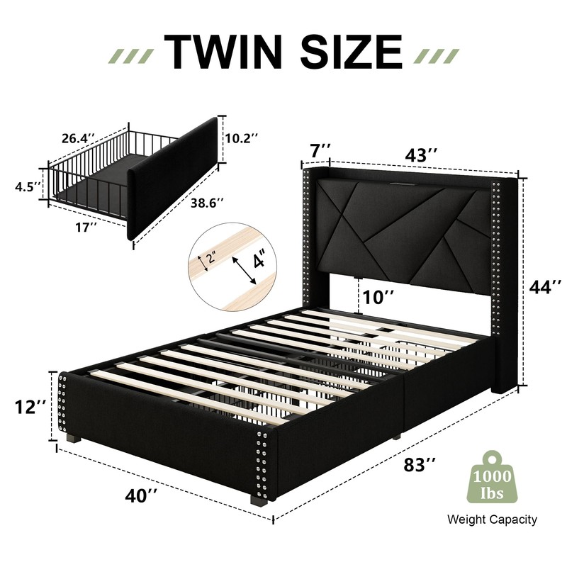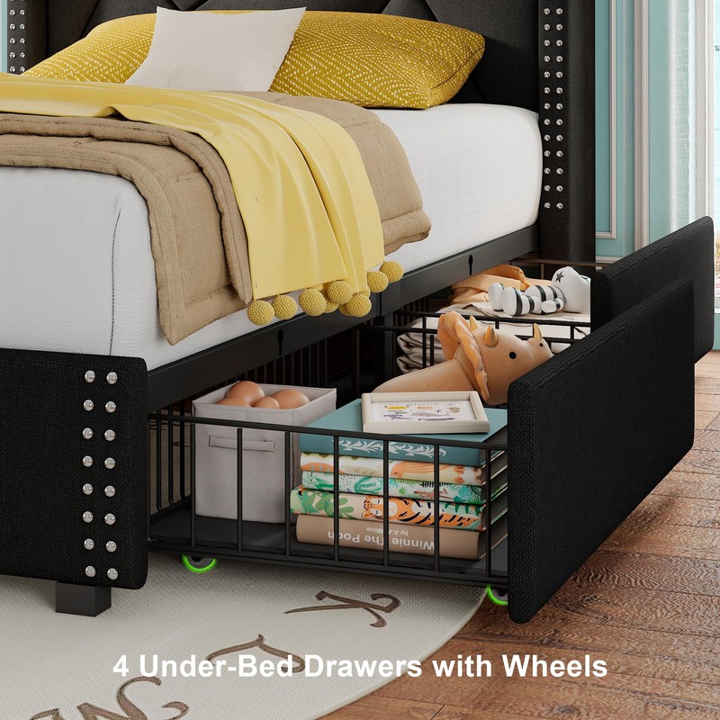 Feonase Upholstered Storage Bed Frame Twin Size with 4 Drawers, Platform Bed with Charging Station & Wingback Headboard, Solid Wood Slats Support, Black