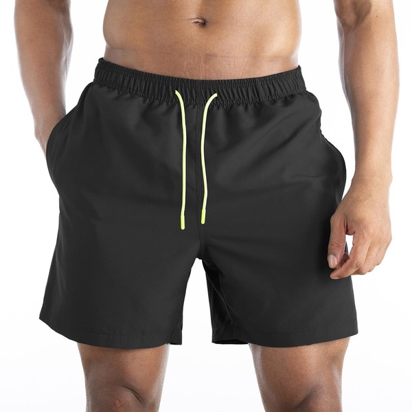FEOYA Men Board Shorts Quick-Dry 3D Printed Swimwear Swim Trunks Vacation Beach Shorts Waterproof Double-Layer Black L