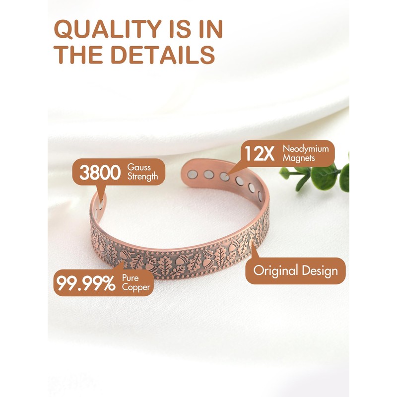 - Nature-Inspired Design: Original Nature's Grace collection - where pure copper magnetic bracelets showcase the enduring spirit of growth. Engraved Oak motifs reflect inner strength, while magnetic elements embrace holistic well-being for a harmonious blend of nature and wellness.
