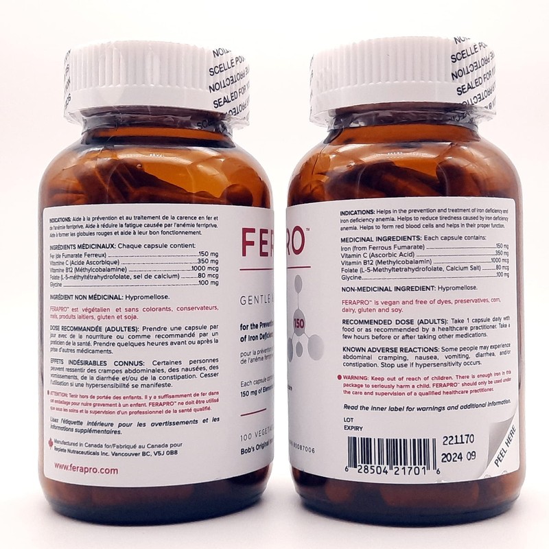 FERAPRO™ 150MG 100 CAPS | Vegan Iron Supplement | With Vitamin C 350mg, Methylcobalamin 1000mcg, 5-MTHF 80mcg, and Glycine 100mg