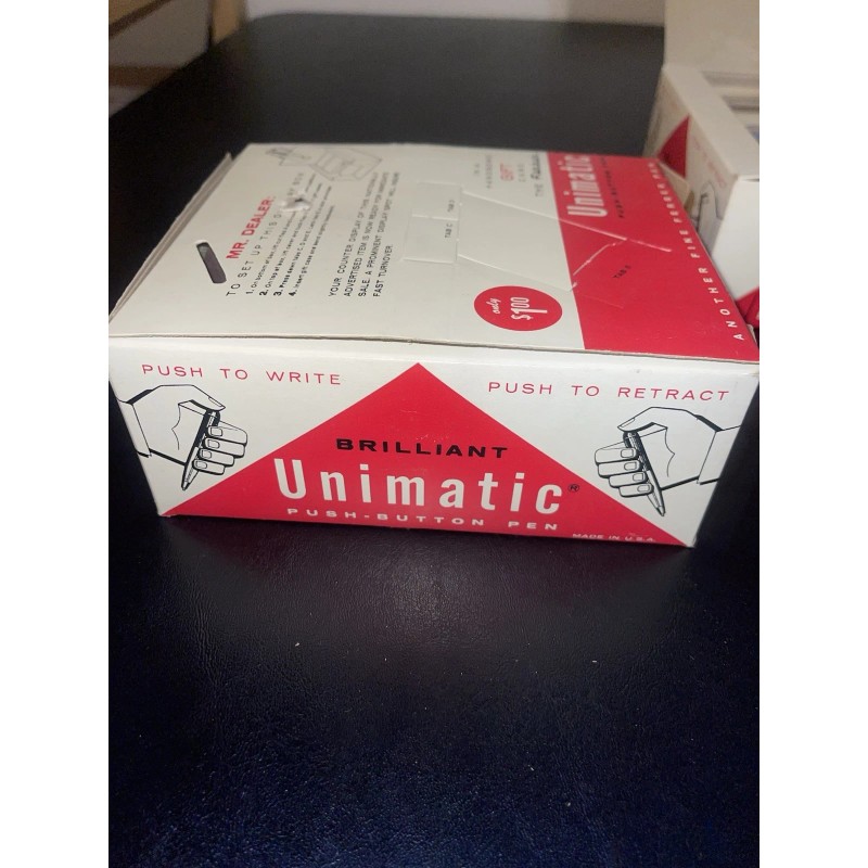 The Ferber unimatic push button pen. In gift case. They look to be from the 50’s -60’s they’re new. Stock each box contains 12 gift pens. Selling by the box not individually. There’s 3 available as seen in photos.