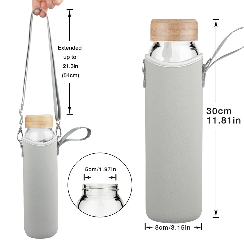 • Die Glasflasche wird mit einer schützenden Neoprenhülle geliefert. Das Weithals-Design ist leicht zu waschen.