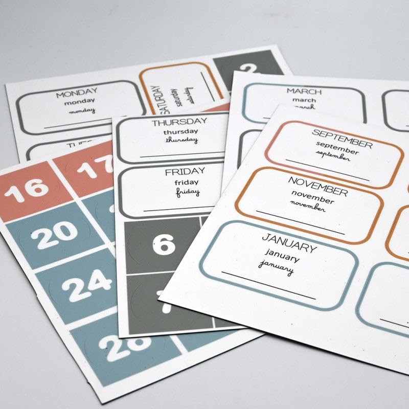 - Product features: our 50 magnets are distributed in 5 sheets, consisting of: 7 magnets for the days, 12 magnets for the months, 31 magnets for the numbers. Children can practice labeling the days and months with a water-based pen on the labels.