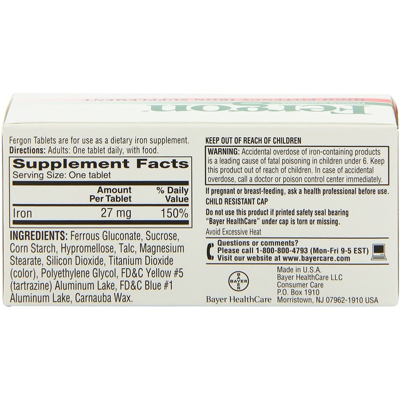 - BIOAVAILABLE IRON: Made with Ferrous Gluconate, a highly absorbable form of iron, Fergon High Potency Iron supplement causes fewer side effects such as the upset stomach, bloating, or constipation that can often accompany iron supplements.