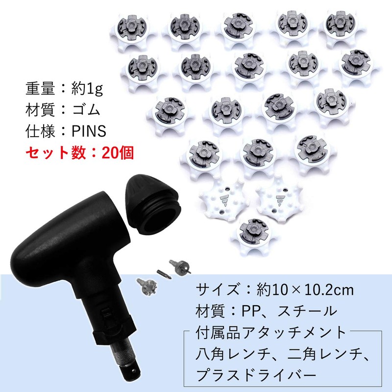 (studs) Weight: Approx. 0.04 oz (1 g). Material: Rubber. Specifications: PINS. Number of Set: 20. Color: White. Handle Wrench: Approx. 3.9 x 4.0 inches (10 x 10.2 cm). Material: PP. Steel; Attachment: Octagonal wrench, diagonal wrench, Phillips screwdriver. Color: Black. *Depending on your monitor settings, there may be slight differences in the color may be some differences in the viewing conditions.