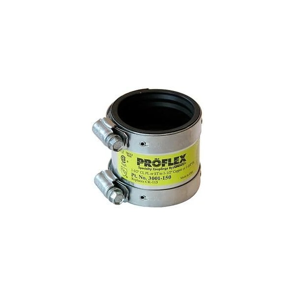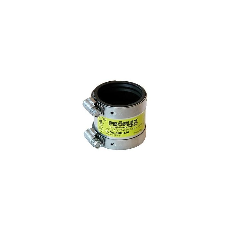 Fernco provides the 3001-150 Proflex shielded coupling for seamless connections between cast iron, plastic, or steel pipes to copper pipes. This coupling is designed for 1-1/2 inch diameter connections, essential for plumbing and drainage applications.