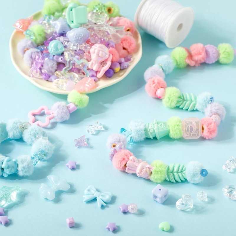 - Package Contents: our DIY kit includes 50 plush beads and 200g approximately 200-260 pieces assorted acrylic mixed color beads, a 40-meter roll of white elastic string; With two different materials for beading, you get four vibrant colors and various styles including plush, transparent, solid, and glitter options