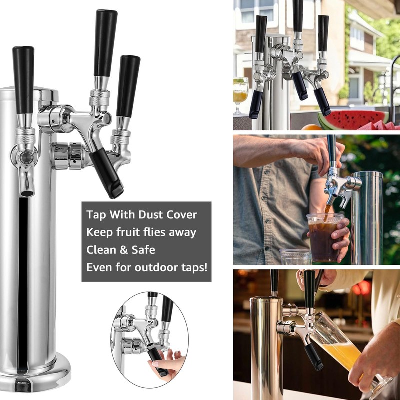- New Upgraded Triple Beer Tower: Compared to single/double beer tap kegerator tower , 3 tap kegerator tap kit allow you to enjoy 3 drinks at once or speed up dispensing to meet your various needs. Improved self closing springs and continuously improving. Package includes 2 springs for installation of self-closing faucets. The springs are so strong that one hand may be needed for installation. The self closing faucet is the end of dripping