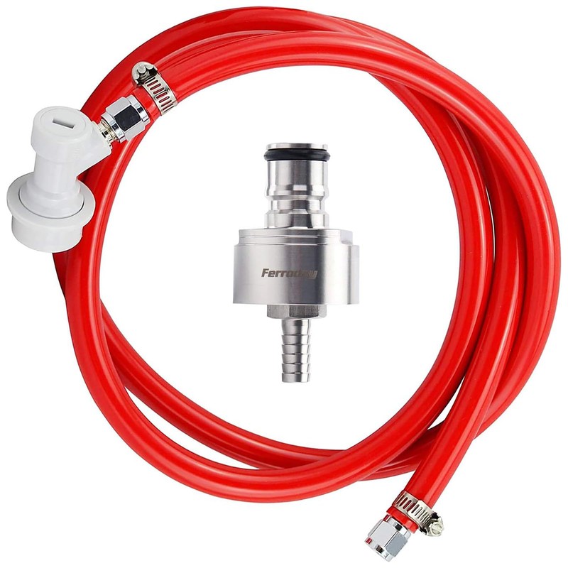 - [Right to Use Kit]: A ball lock disconnect connector, a pair of 5/16 stainless steel swivel nuts and 2 stainless steel hose clamps, 1 of 5ft 5/16 ID red gas hose. 5ft is long enough for daily use. The long gas line allows you to place the co2 tanks optionally. A perfect tool to meet the needs of home brewers!