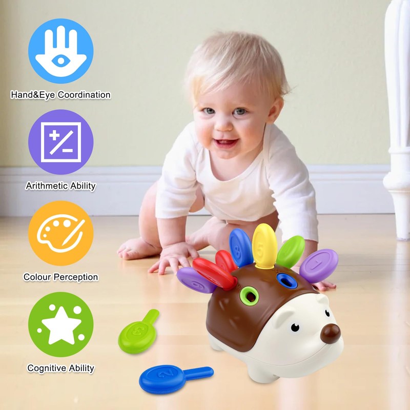 - Cute appearance: This motor skills toy has a cute hedgehog shape with 10 cheese cane-shaped slots. The cheese sticks are available in 5 colours, 2 for each colour. This cute and interesting appearance will be very popular with children.